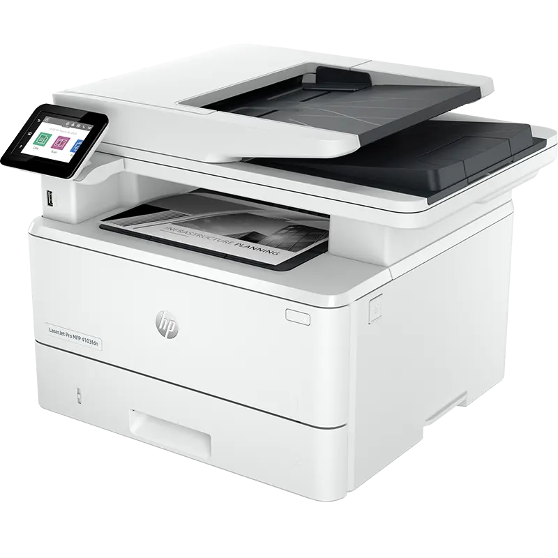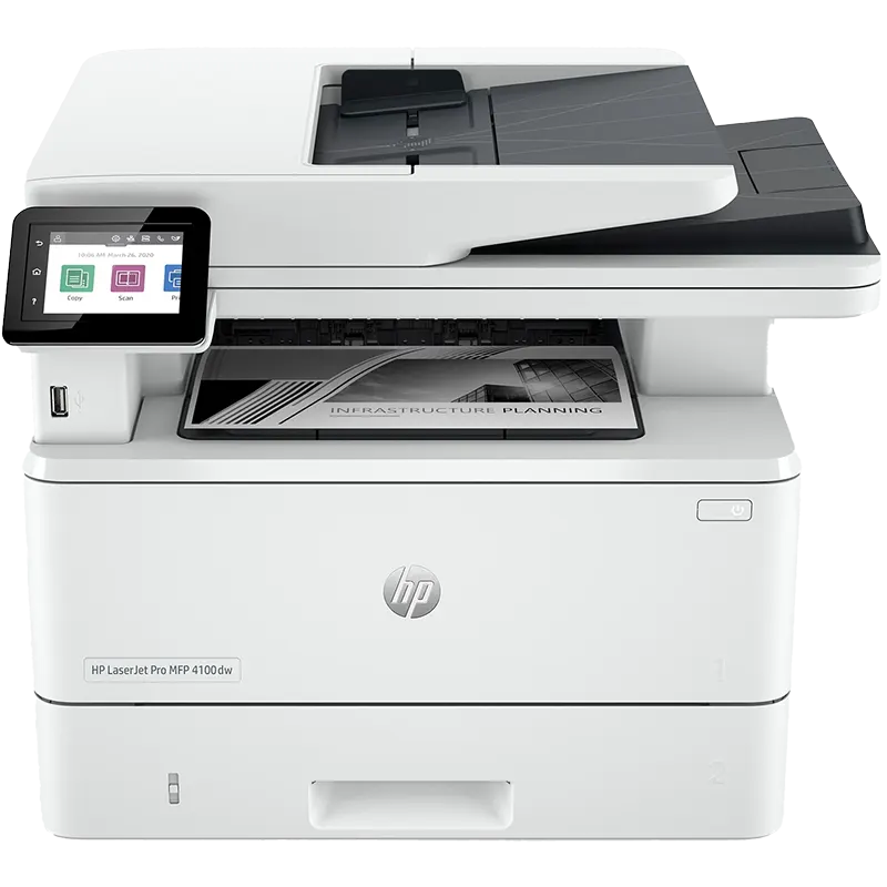 - HP LaserJet Pro MFP 4103fdn multifunction printer with comprehensive four-function and network capabilities