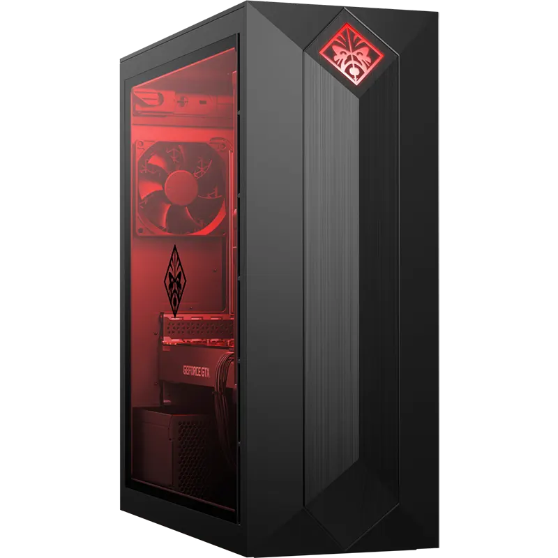 - Construction: HP OMEN series tower chassis with professional gaming aesthetics featuring angular design elements and tempered glass side panel.