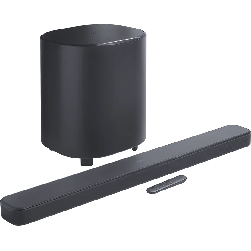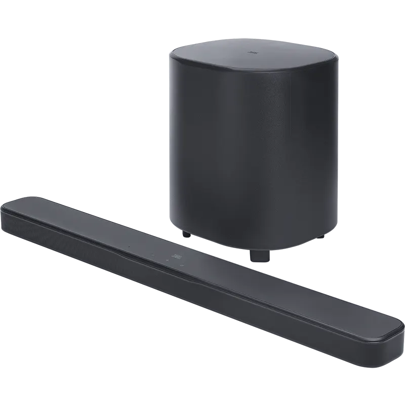 - JBL Bar 500MK2 main soundbar with comprehensive 5.1 channel audio processing and wireless connectivity