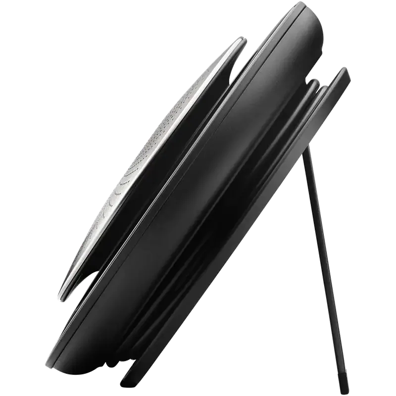 - Folding Stand: Adjustable stand folds out for upright music playback or lays flat for conference calls