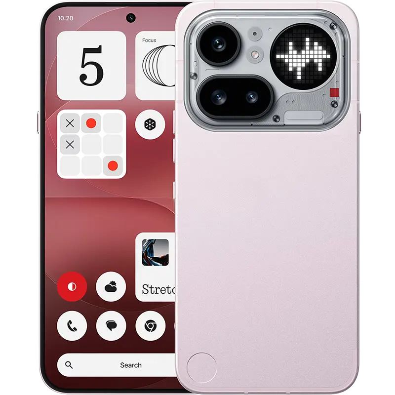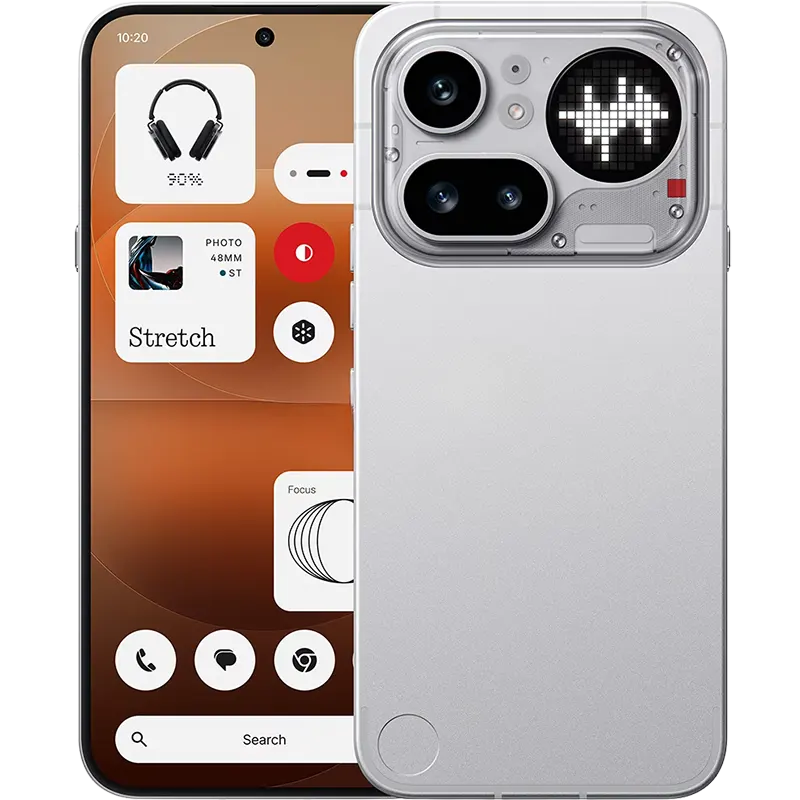 - Glyph Matrix: 137 individually controllable LEDs arranged in a circular dot matrix with four brightness levels and contact-specific notification patterns