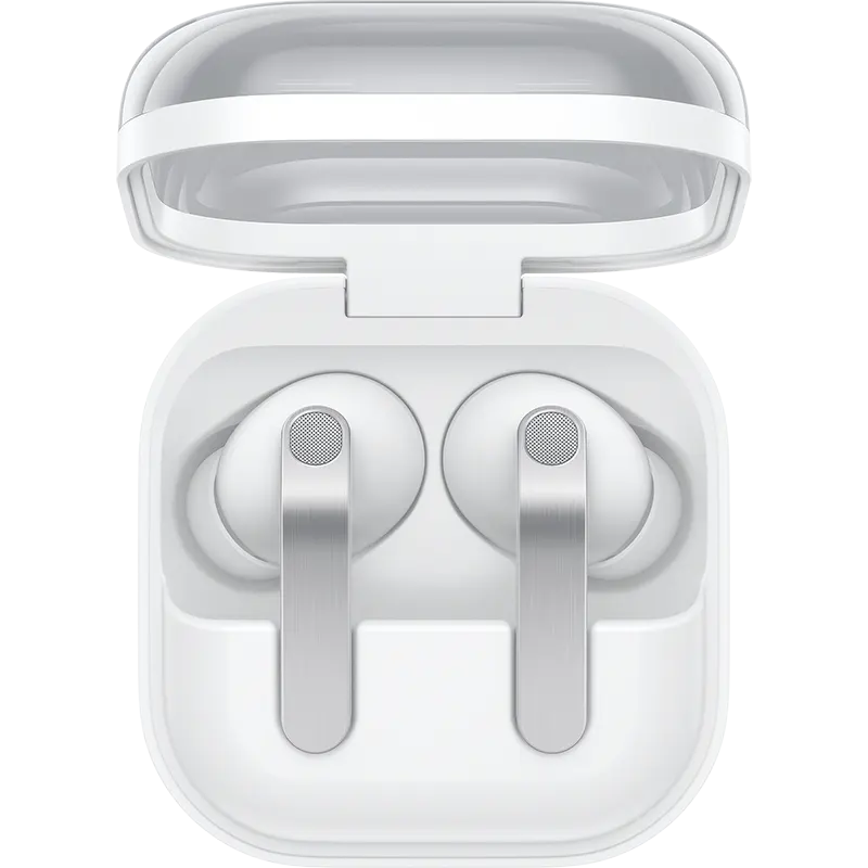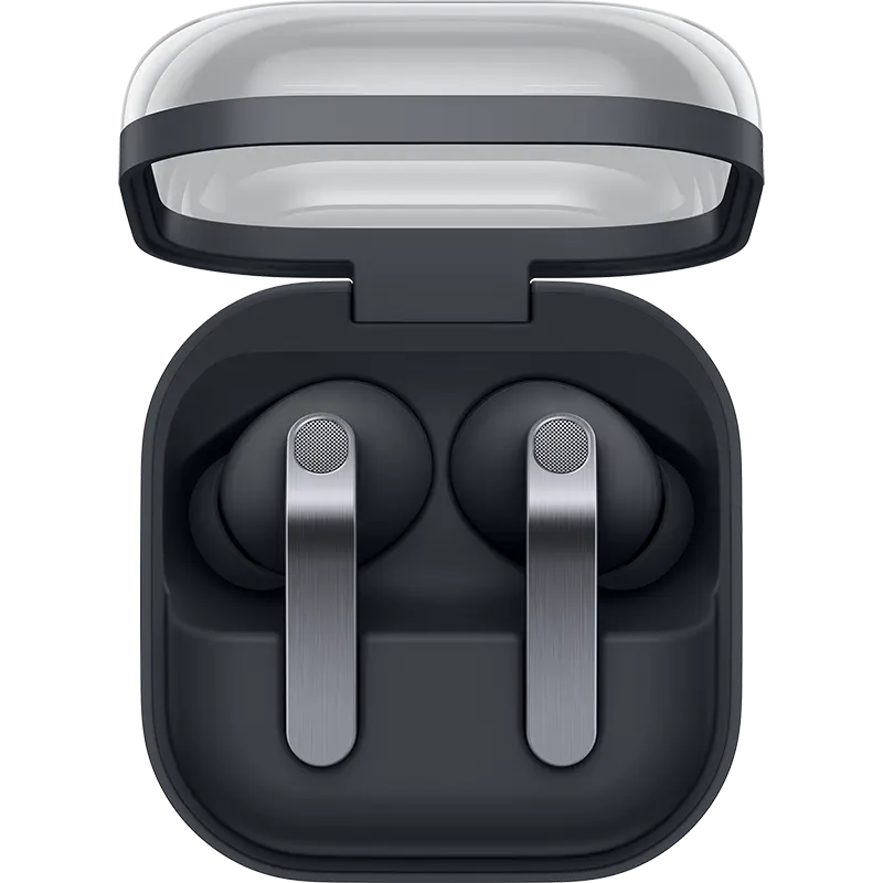 Samsung Galaxy Buds 4 Pro use a canal-fit design with silicone ear tips that create a proper acoustic seal inside the ear canal, and Samsung redesigned the earbud body to be smaller than the Galaxy Buds 3 Pro for a more secure, less intrusive fit. Each earbud weighs 5.1 grams — among the lightest sealed earbuds in this price category — shaped through computational design analysis that Samsung claims analyzed over 100 million ear shapes globally. Three sizes of interchangeable silicone ear tips (small, medium, large) allow you to find the seal that matches your ear canals, and the Galaxy Wearable app includes an ear-fit test that confirms whether your selected tips provide an adequate seal for maximum sound quality and ANC performance. The flat blade stems with brushed metal plating feature subtle indentations at the pinch control area, positioned where fingers naturally rest for comfortable, accurate gesture input without needing to press firmly or fumble with the controls. Reviewers who wore the earbuds for flights, extended work sessions, and daily commuting reported minimal ear fatigue compared to previous Samsung earbuds generations. The redesigned magnetic docking inside the transparent clamshell charging case makes it easier to seat the earbuds properly for charging — a small improvement over previous case designs that occasionally required repositioning to establish a charging connection.