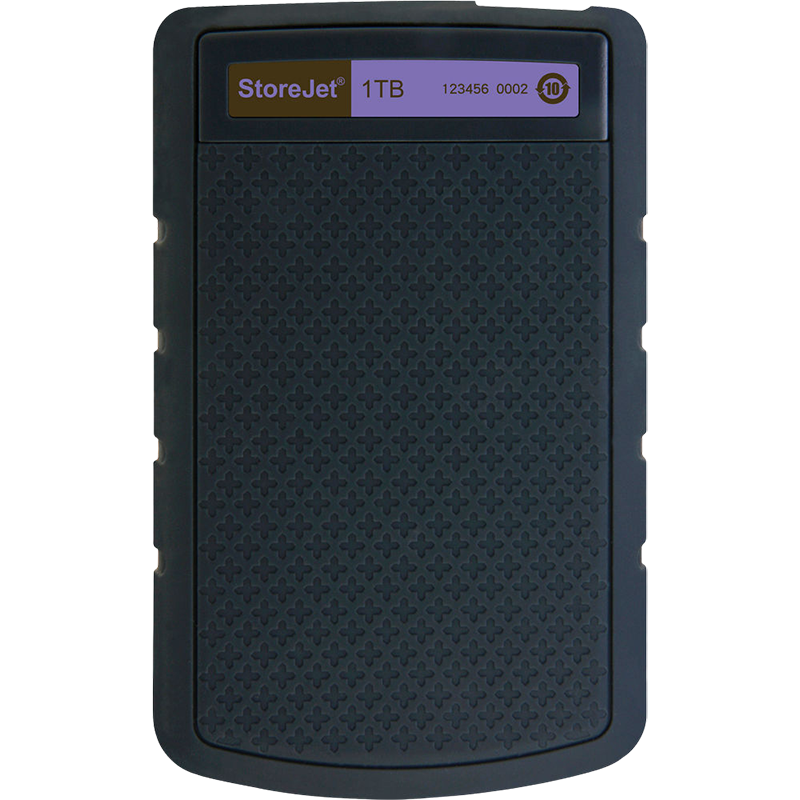 - Transcend StoreJet 25H3 ruggedized portable hard drive with military-grade shock protection and anti-slip texture