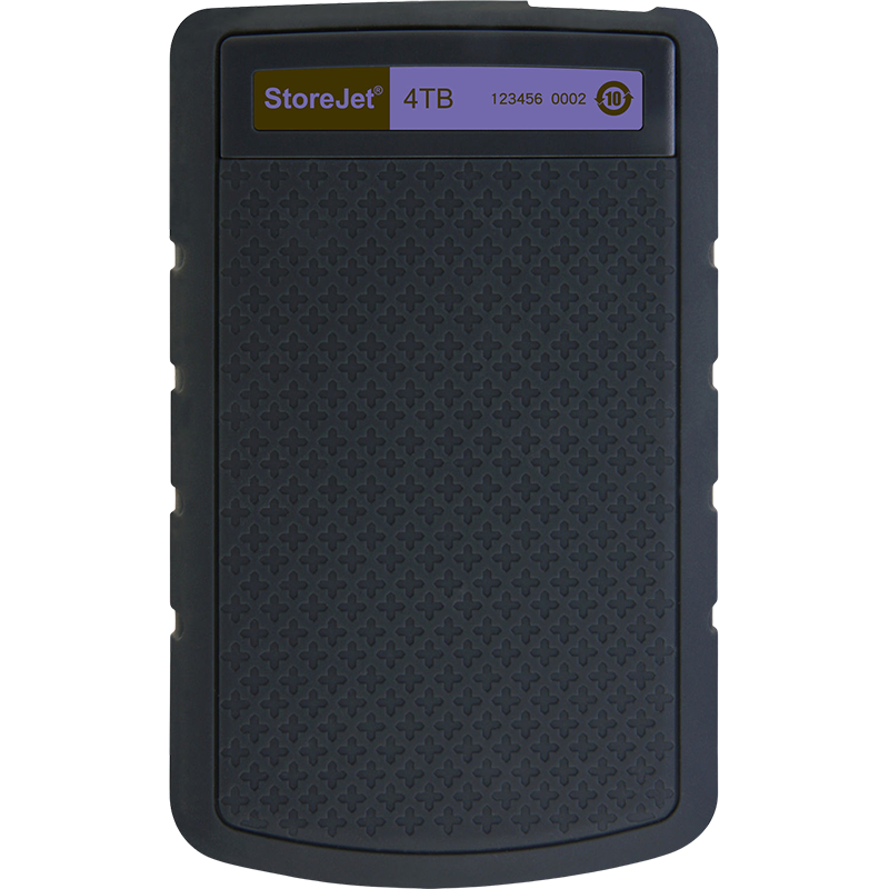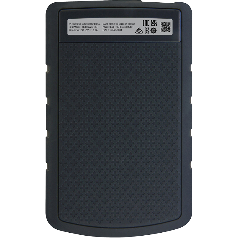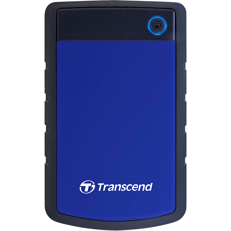 - Transcend StoreJet 25H3 ruggedized portable hard drive with military-grade shock protection and anti-slip texture